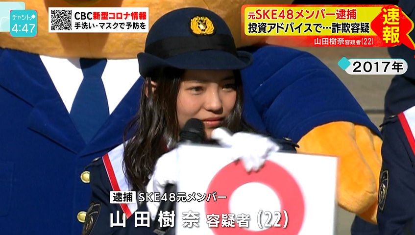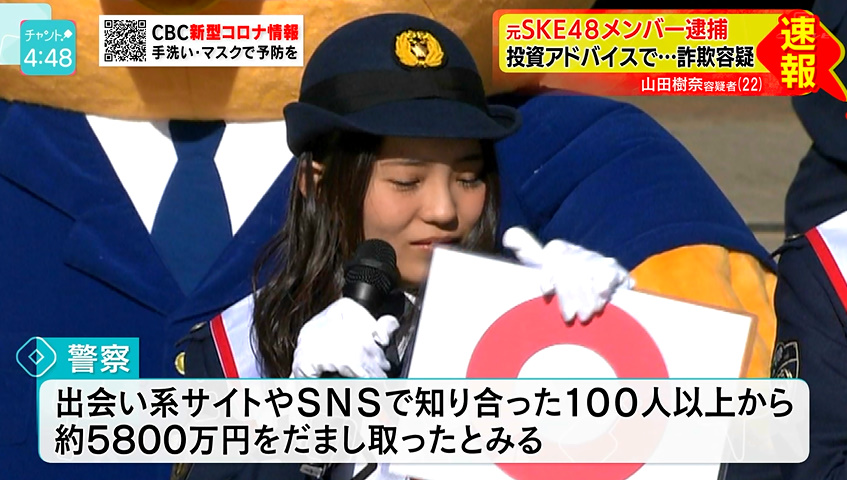 為替相場の価格変動を予想して投資する金融商品「バイナリーオプション」の助言名目で金をだまし取ったとして、愛知県警は16日、詐欺などの疑いで、アイドルグループSKE48の元メンバー山田樹奈容疑者(22)ら男女4人を逮捕した。