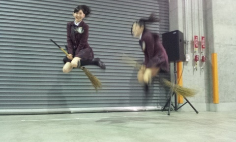 オリーブ公園で、魔法のほうきにまたがりジャンプする江籠さんをご覧ください。